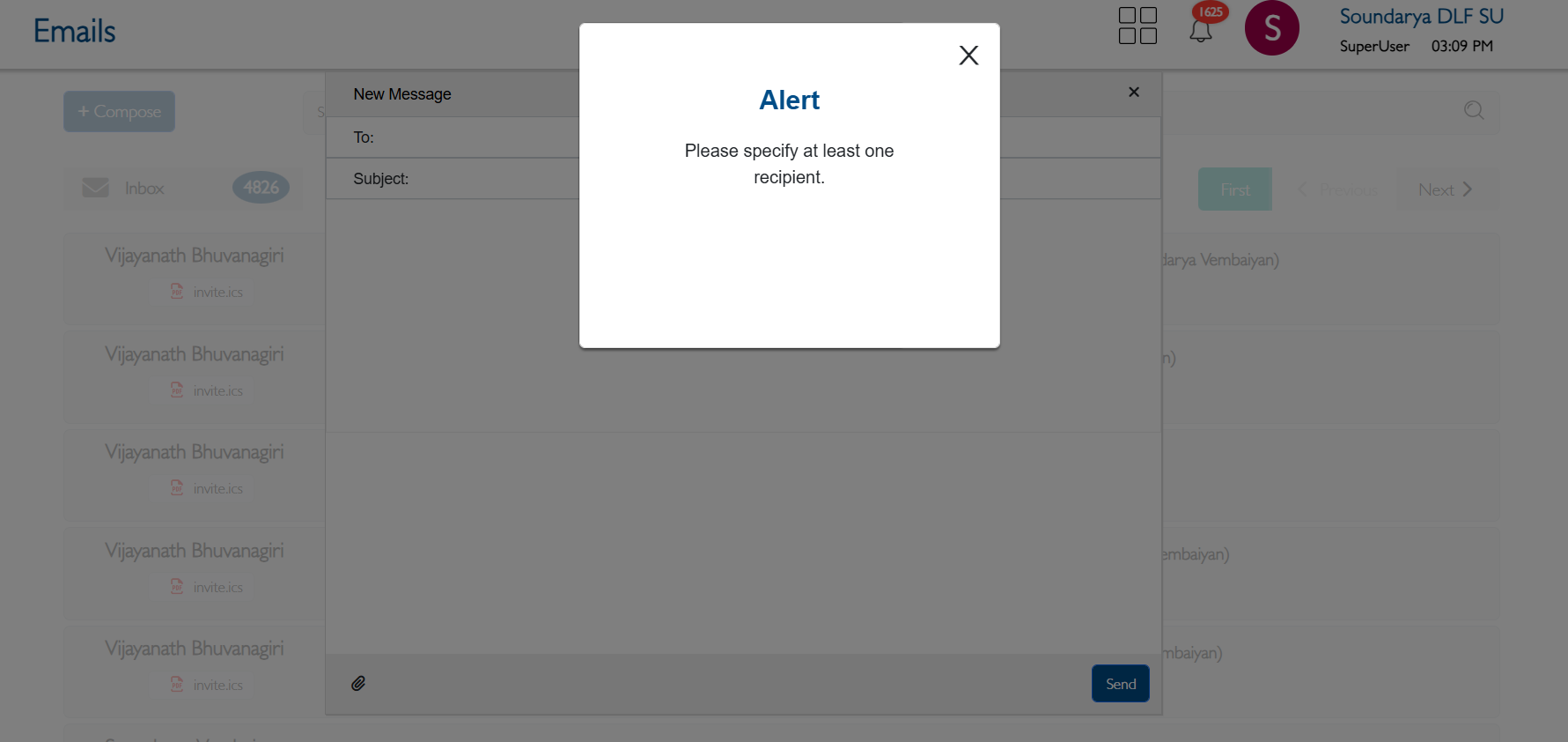 send button is now enabled when only the 'To' input field is filled. However, if no attachment is provided, clicking the send button results in a "Mail not sent successfully" error.