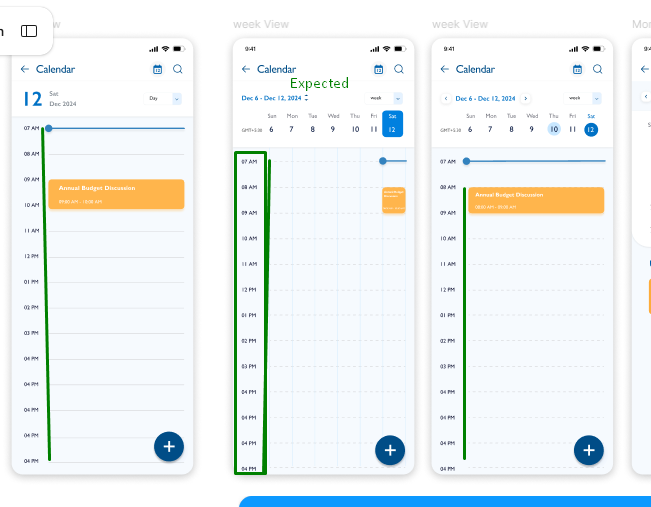 • There ,Time is missing from the Day, Week, and Search bar at the top right corner as per design.