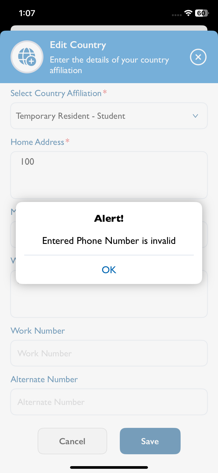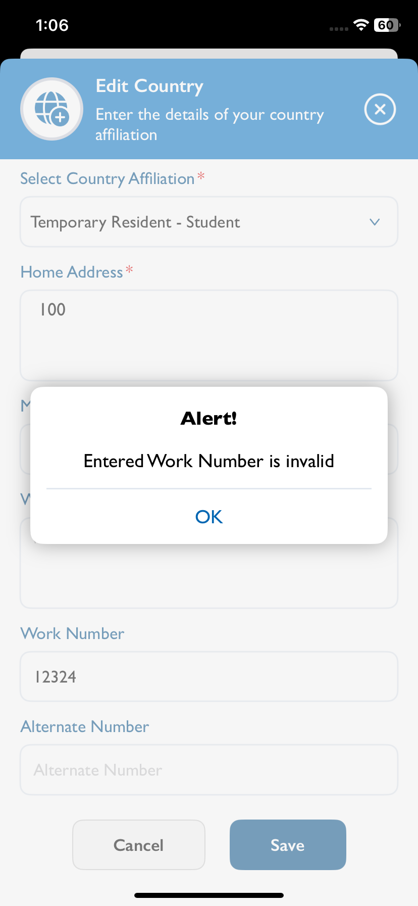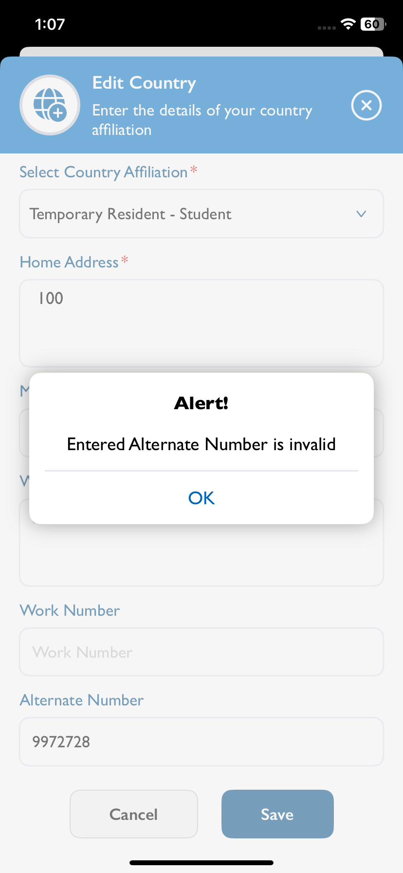 The mentioned issue is fixed, if the Entered Phone, Work or Alternate numbers is invalid. an warning text should appear as per iOS.