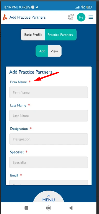In the Add Practice Partners form, the field label is displayed as "Firm Name" instead "First Name"