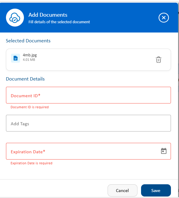 After browsing the document--> click on next --> There will be alerts for Doc ID and Expiration date field.