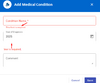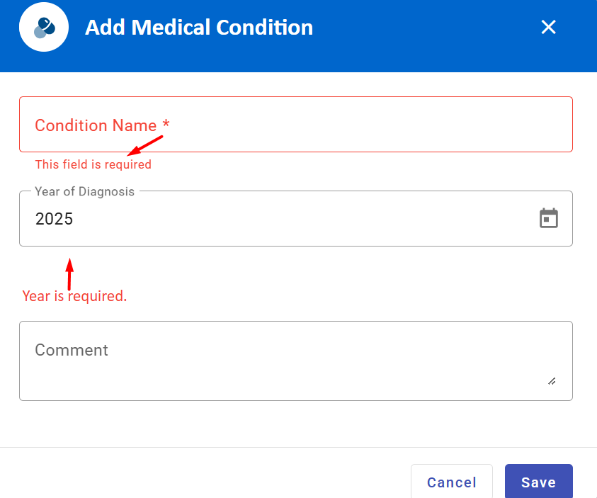 When adding a new medical condition, if all mandatory fields are filled and then deleted, clicking Save triggers only the 'Year' field required warning instead of all relevant mandatory field validations.