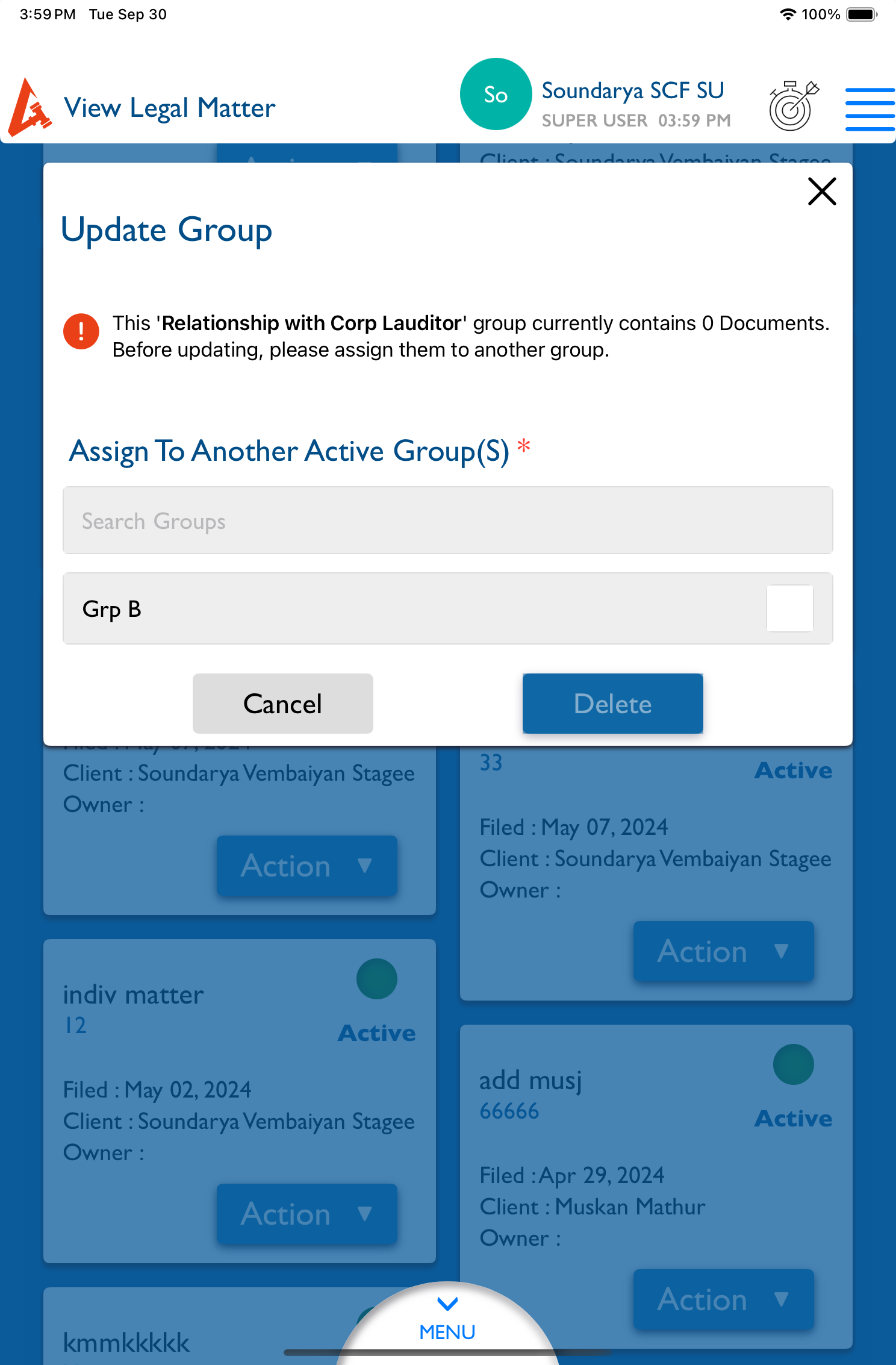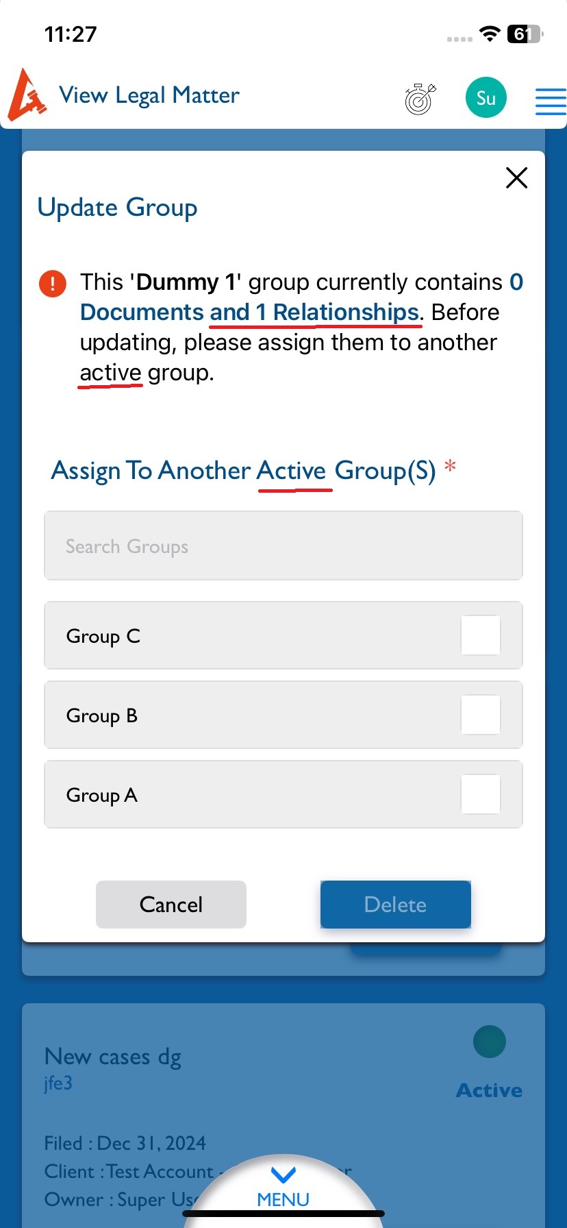 View Matter [Legal/General] - Update Groups : Remove the text "and relationships" and "active".