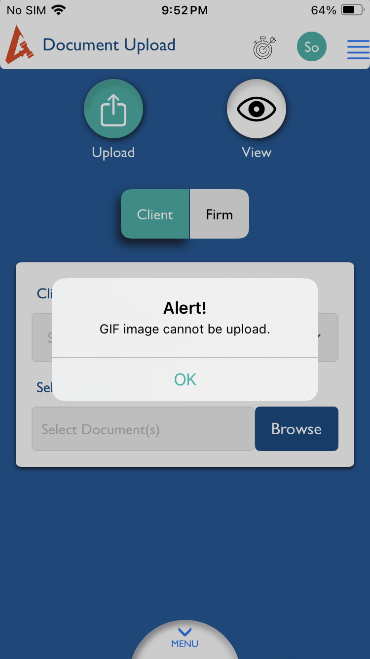 closedDocuments (Upload): The user is currently able to upload .gif, .mp4, and .mp3 file formats, which should be restricted from uploading.