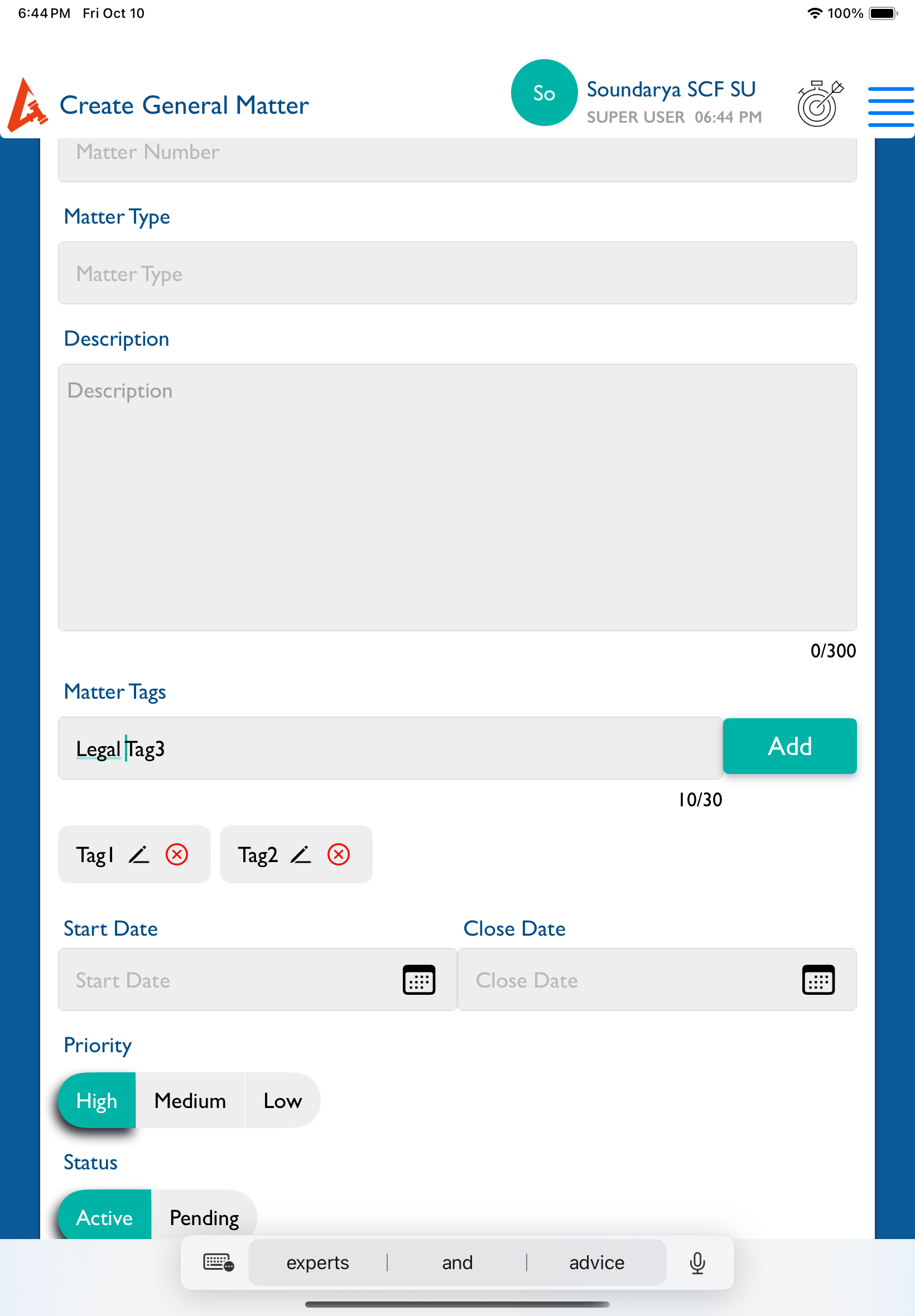 allowing the user to add/edit/remove tags while creating or editing a matter (Legal or General).