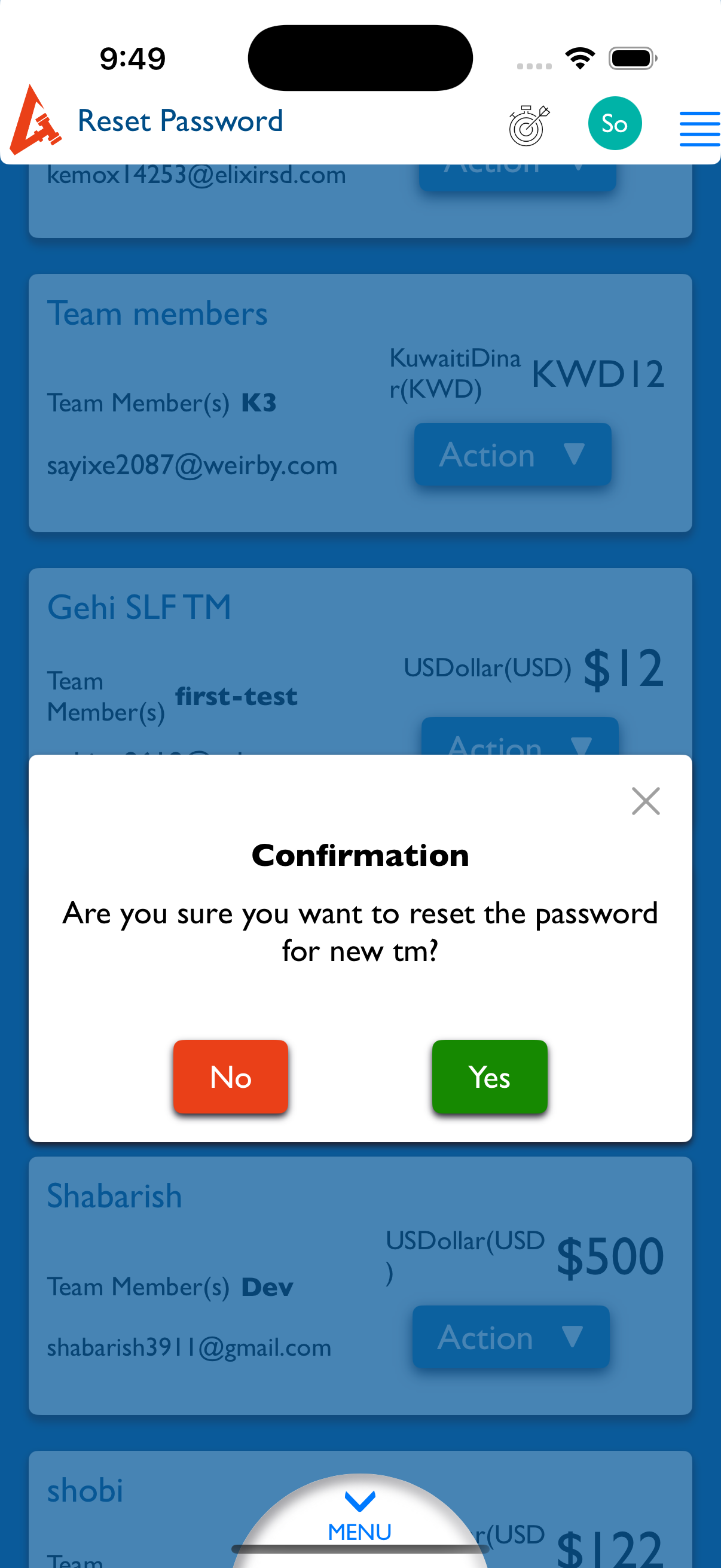 openView Team Member: Missing Confirmation Popup on Reset Password Action.