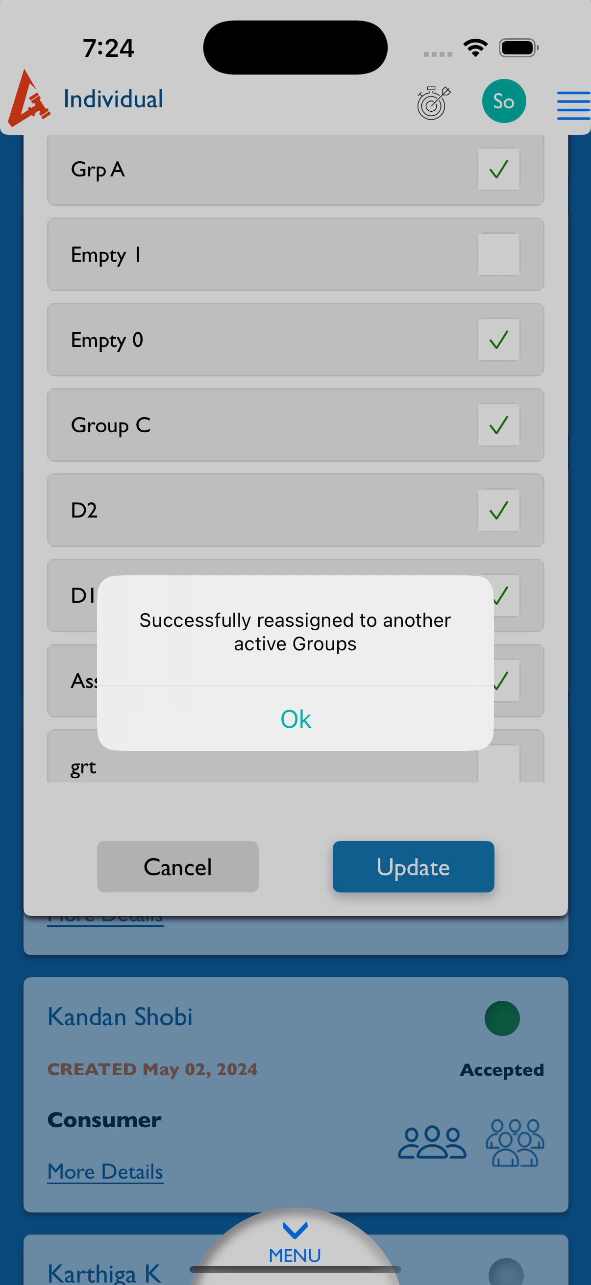 8.The success toast text should change as per web 'Successfully reassigned to another active Groups'