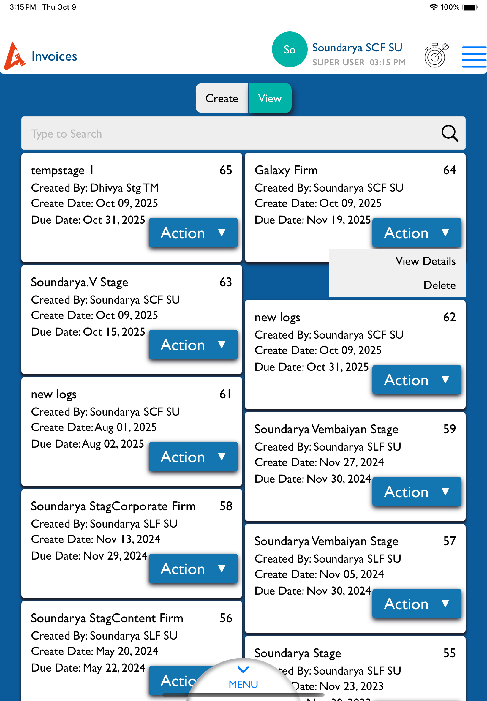 - Go to the View tab, select the recently created invoice, and click on Actions.