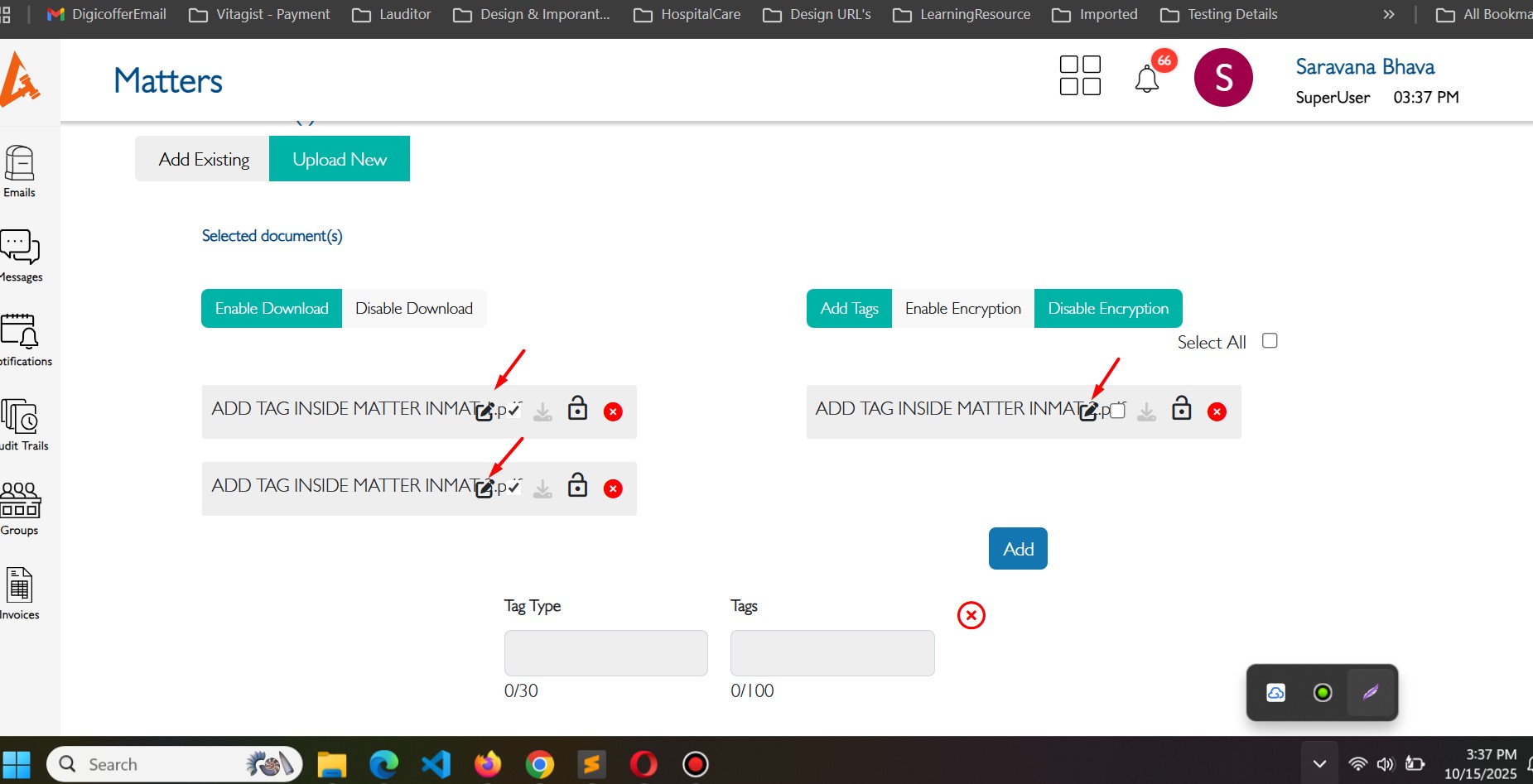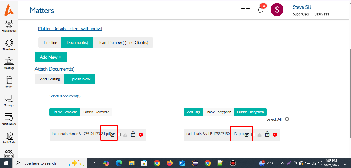 openMatters (View): Try to upload documents within the Matter View Details section. If the document name is too long, the Encrypt, Download, and Add Tags icons are misaligned.