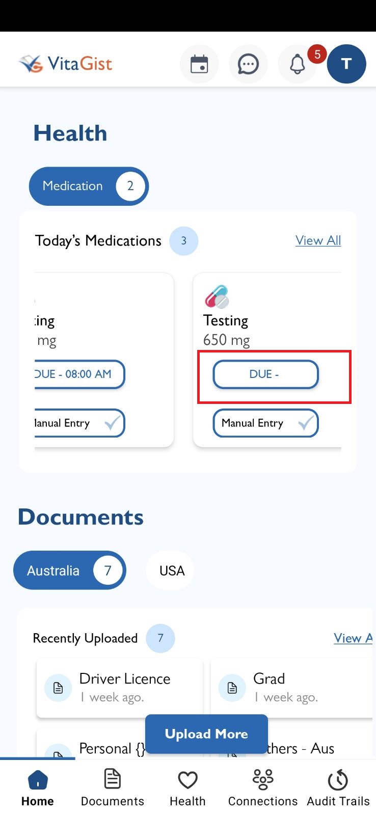 • Medication Card displays specific times (e.g., 8 AM, 9 AM) instead of showing the selected time [8 AM and 8 PM]