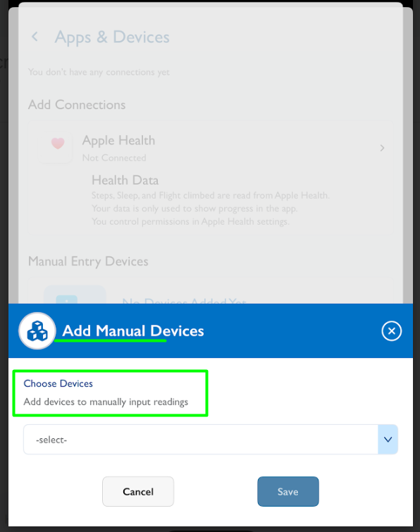 openHealth - Apps and Devices - Add Manual Device Window - UI issues and dropdown not responding.