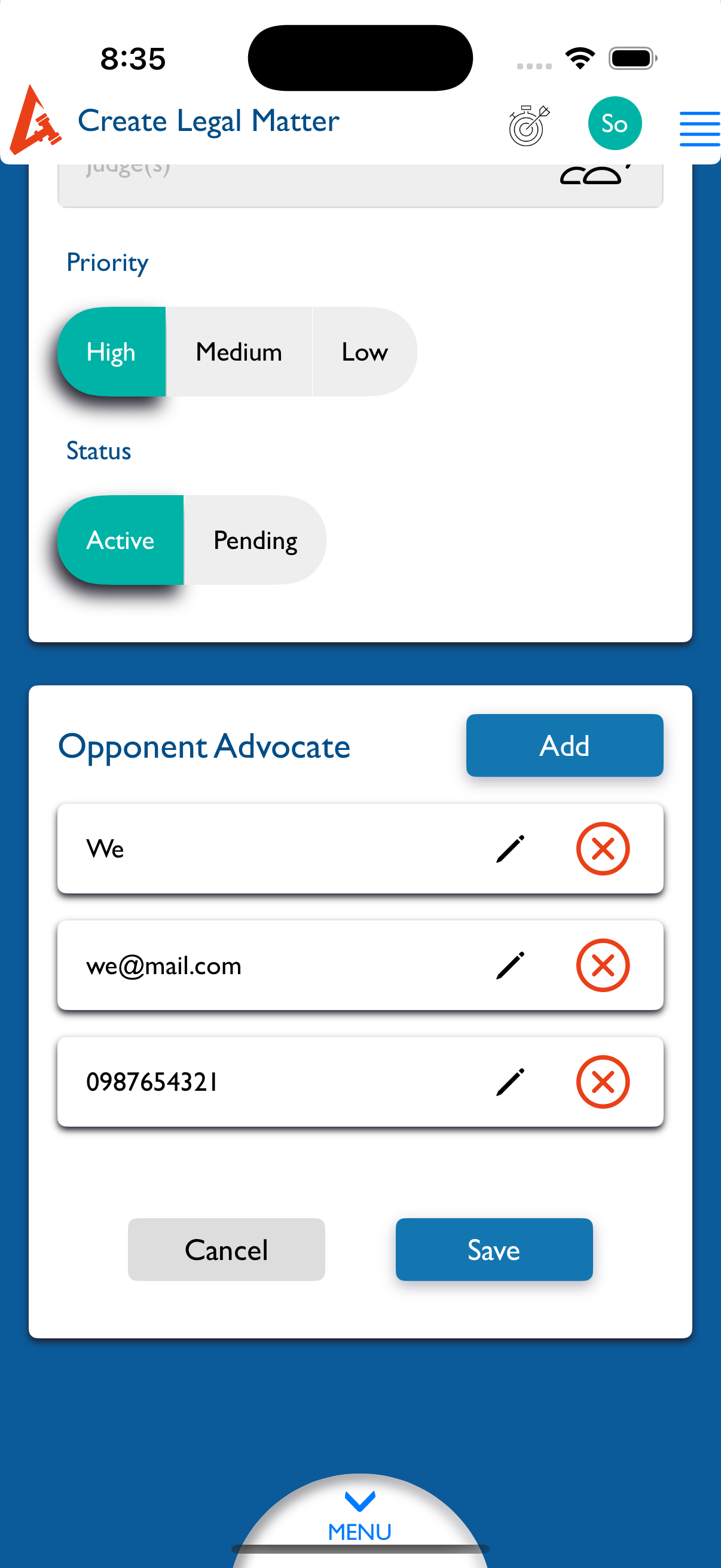 openCreate /View Matter [Legal] : All fields are not mandatory in Opponent Advocate section