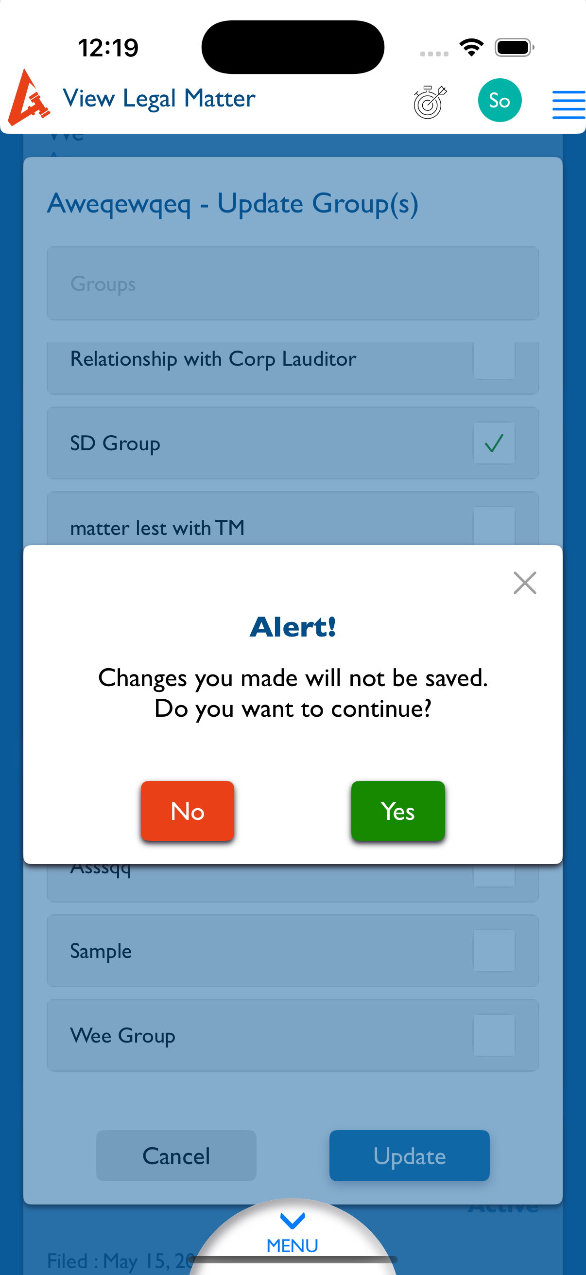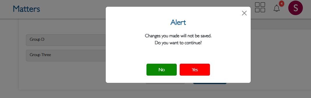 openView Matter - Update Groups: “Leave page” popup should be changed to “Alert” popup.