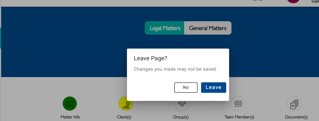 closedCreate Matter [Legal/General] - Making changes in a previous section without saving and then trying to click the wizard circle an alert should display