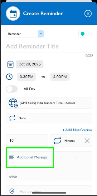 openEvent (Create): The label “Add Description” hint text should be changed to “Additional Message” for Reminder events.