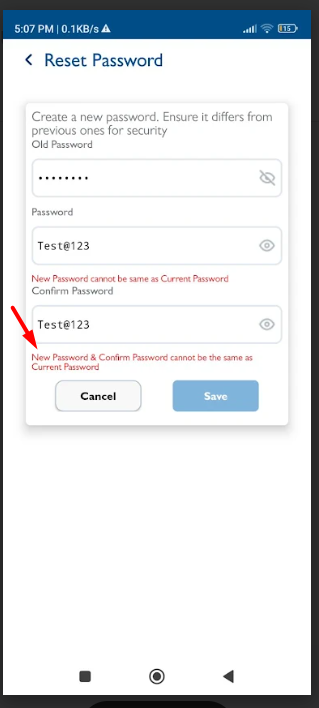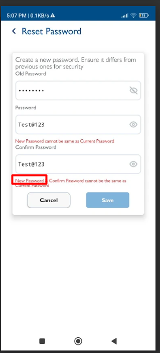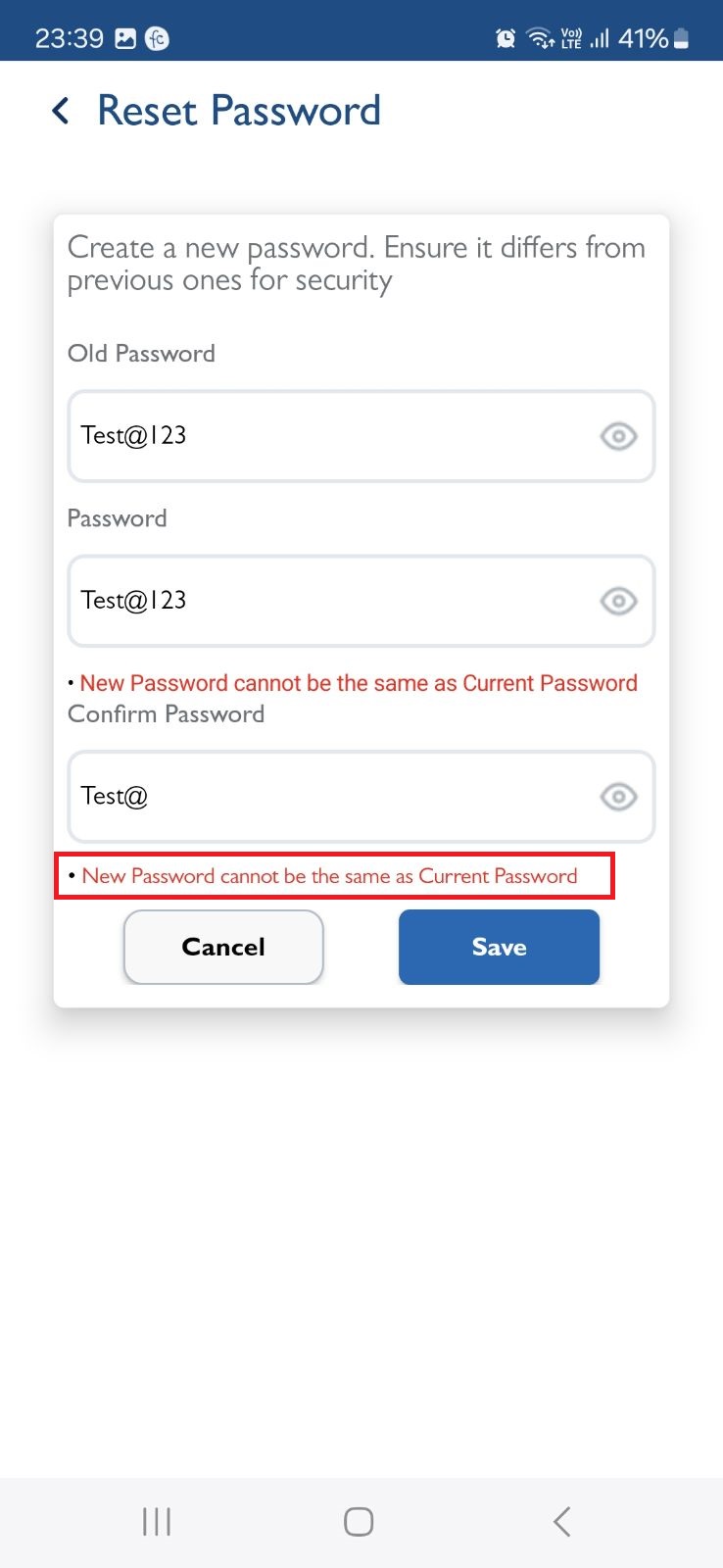 openSettings - Change password - Old and New password should not be same validation should be implemented