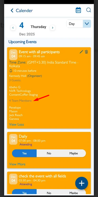 Event participants should be listed in view page as per iOS. The heading "Team members" should be removed.