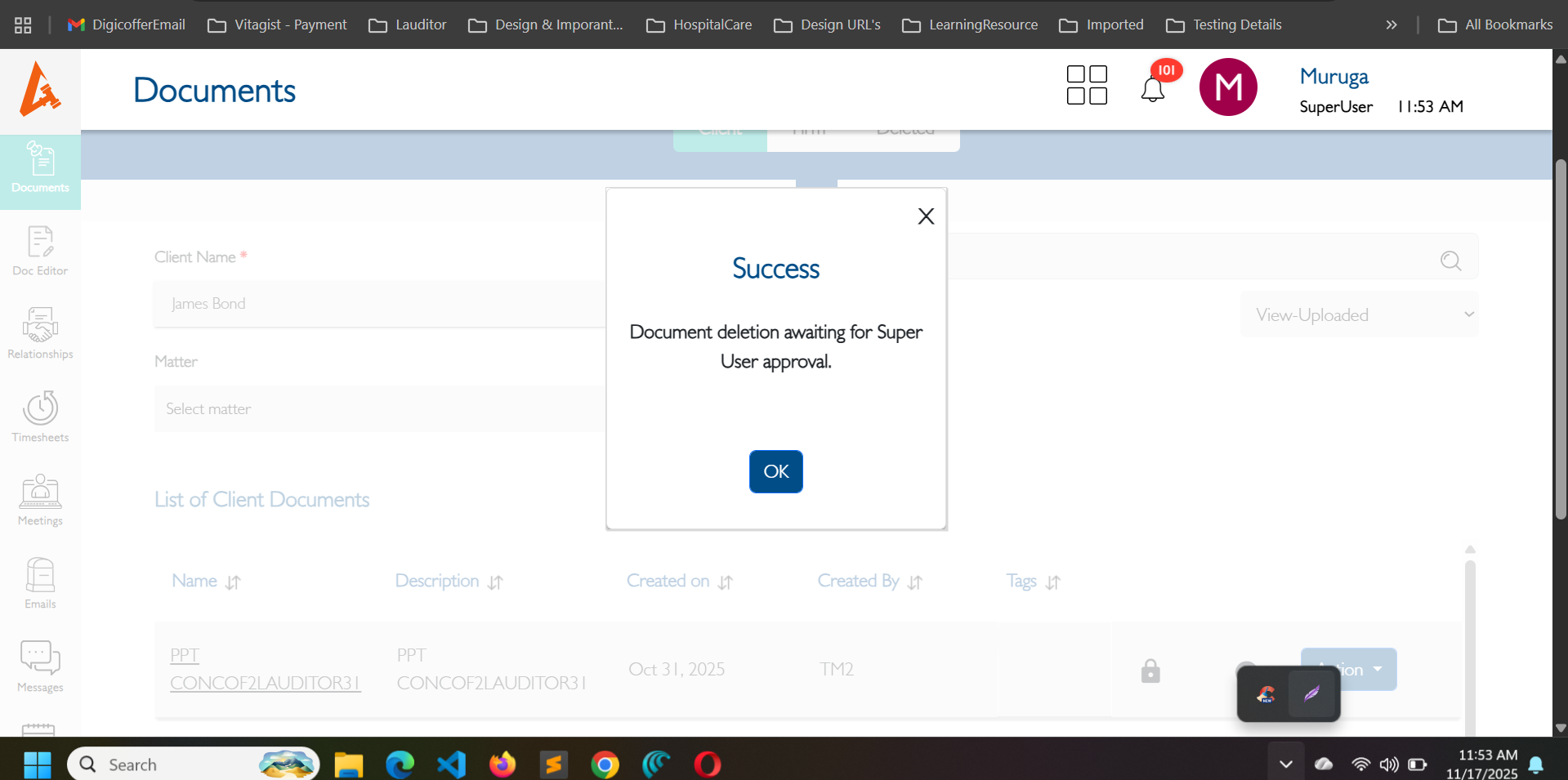 Expected:- The ‘Document deletion waiting for Super User approval’ pop-up should be appear.