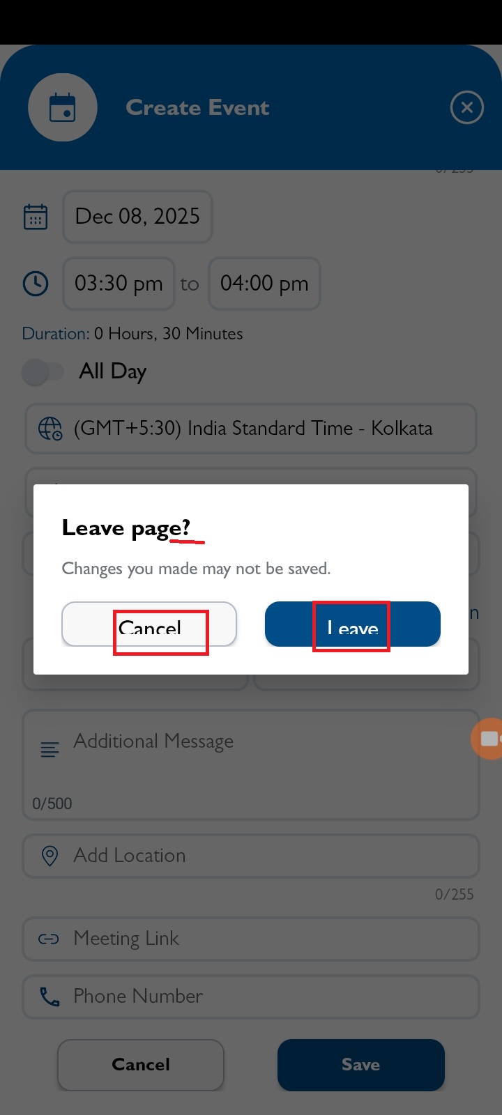 openCreate/Edit Calendar : Cancel and Leave button text should display properly in Cancel popup