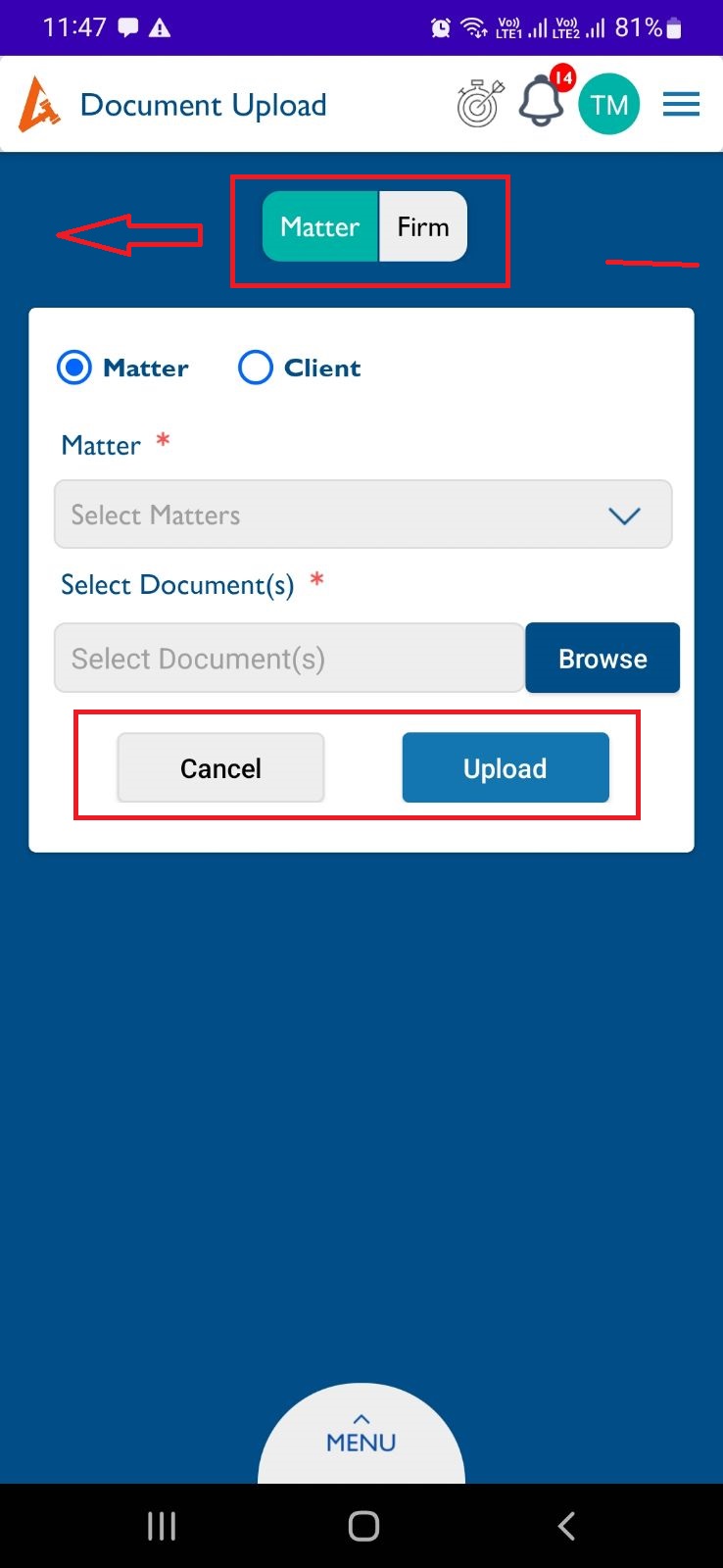 - The Cancel and Upload buttons should not be visible until a document is uploaded.