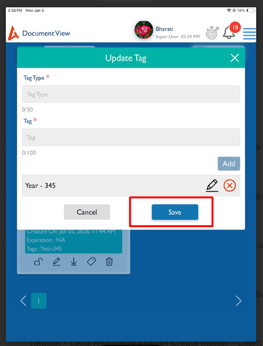 View Documents - Update Tag - Save button remains enabled even when the tags field is empty [Make sure tag should already added to that document]