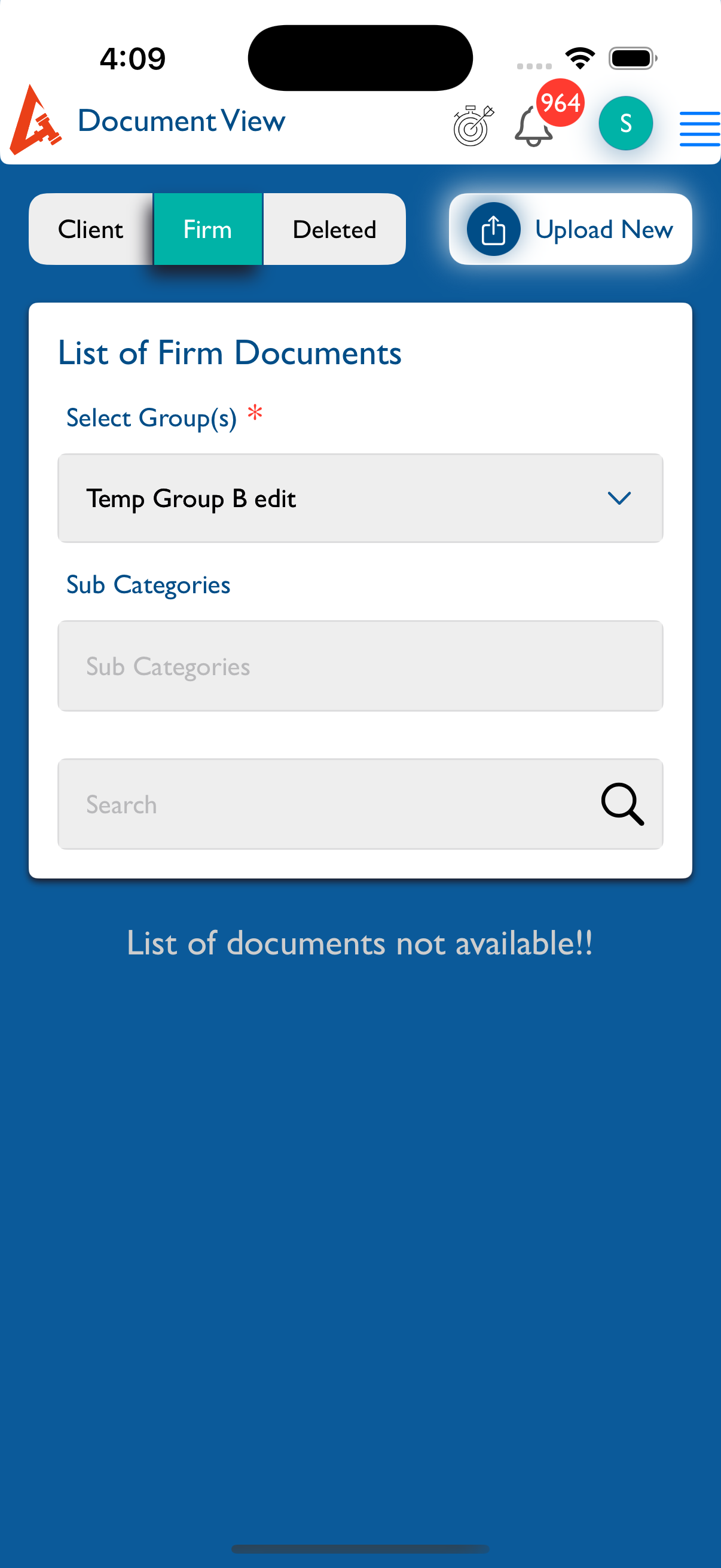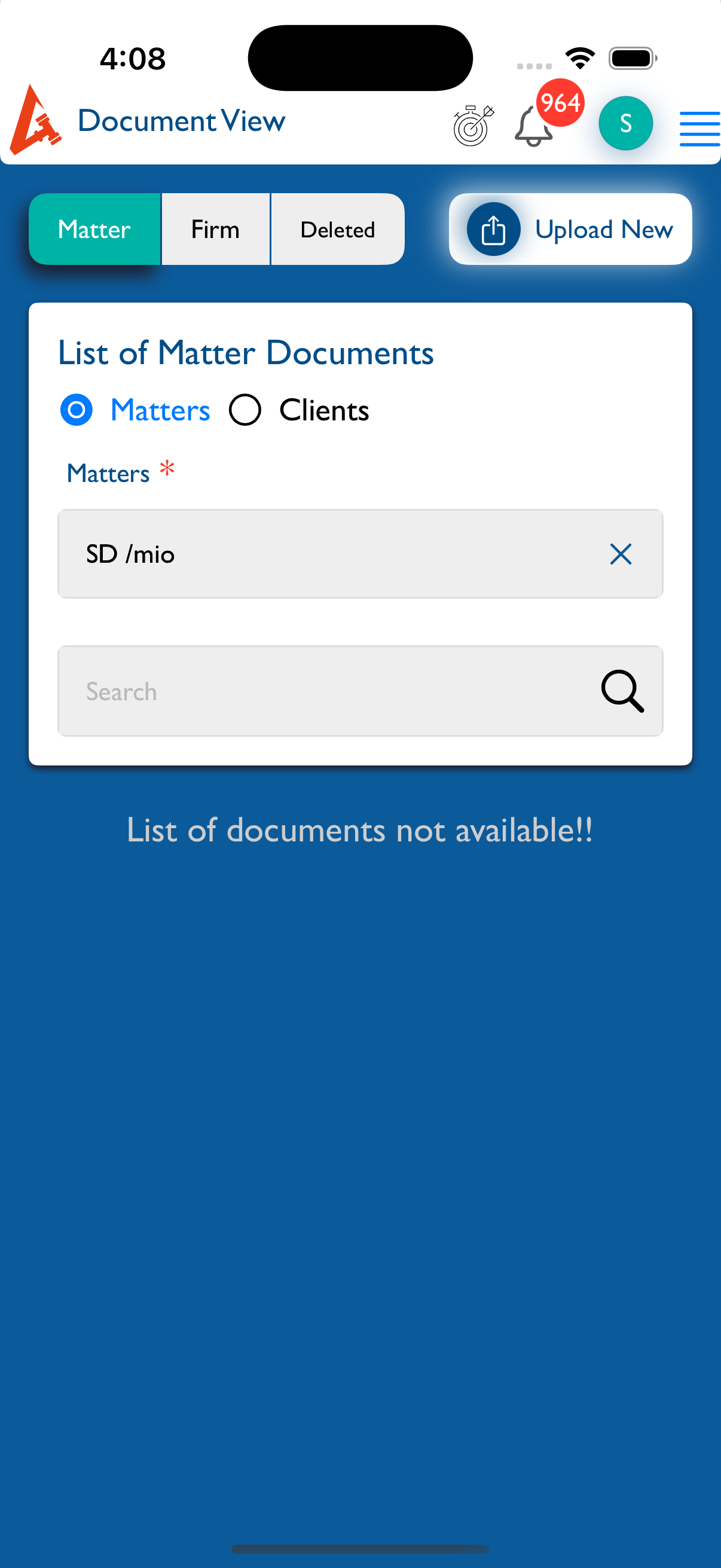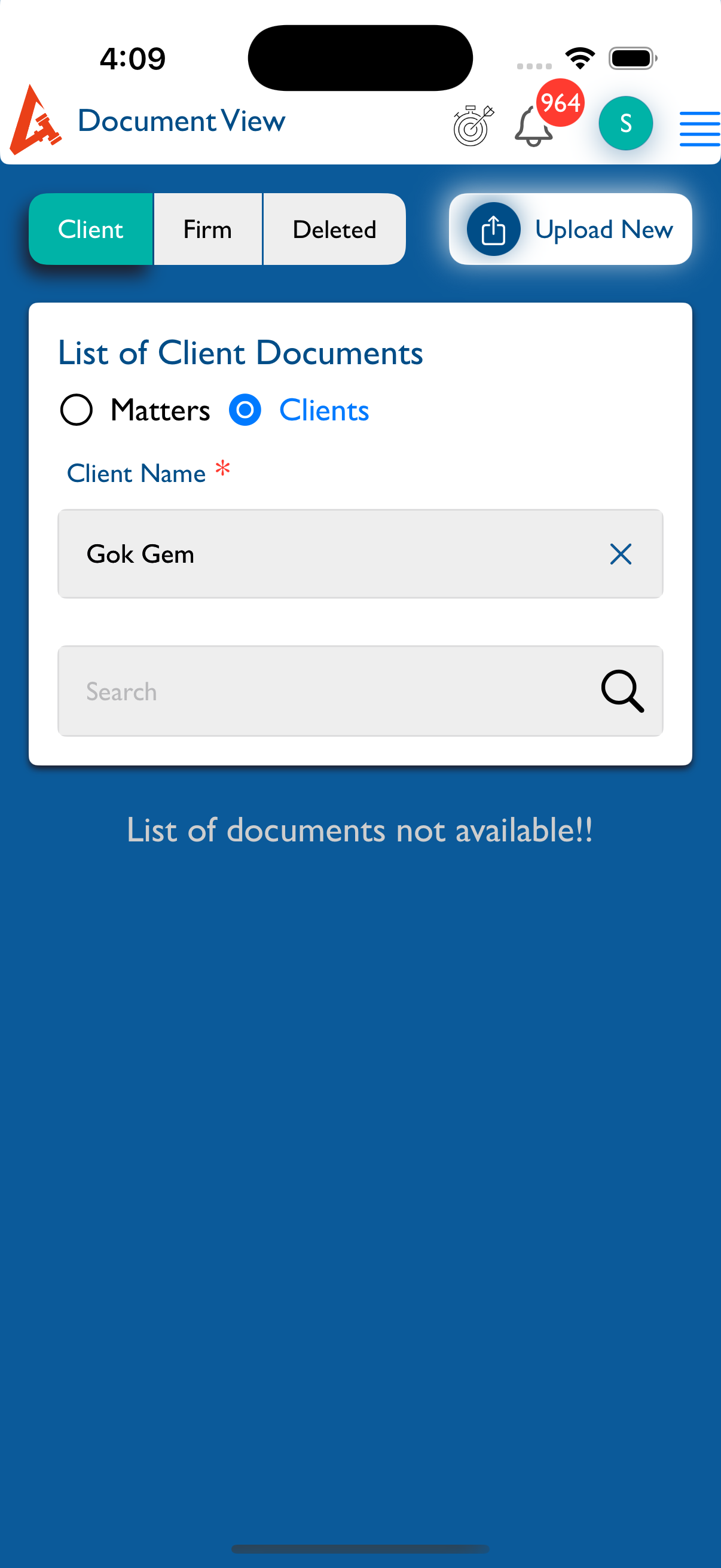 If the selected matter (or client/group) has no documents, the message “List of Documents not available!!” should appear below.