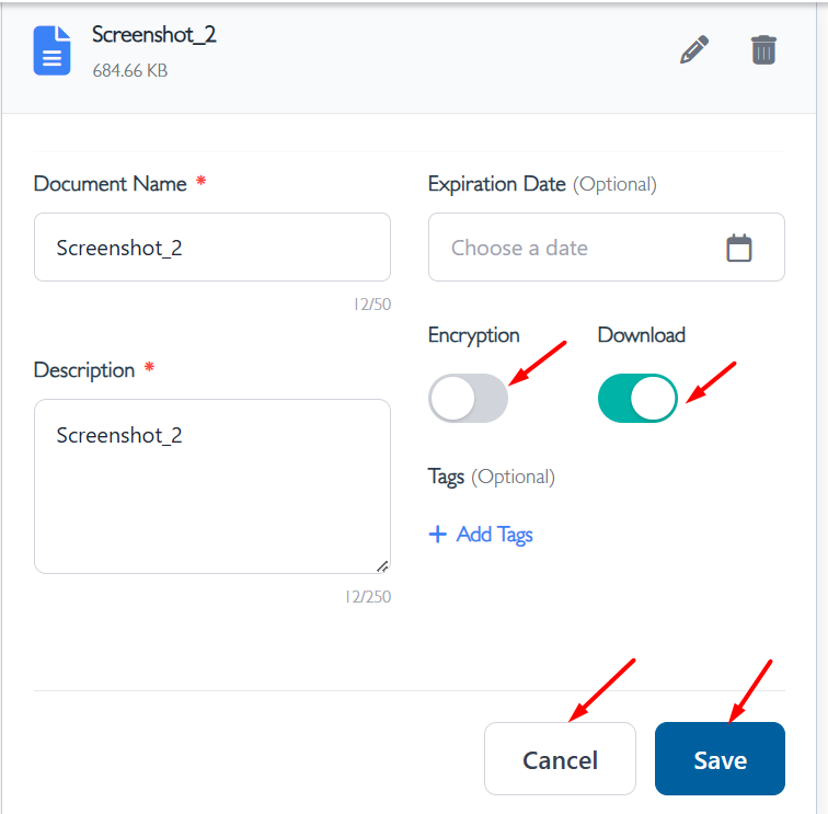 closedDocuments (Upload):- The Enable Encryption and Enable Download toggle button sizes should be reduced, and the font weight should be increased.