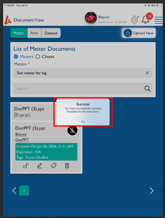 openView Documents - Update tag - When updating the tags, success popup text needs to be updated