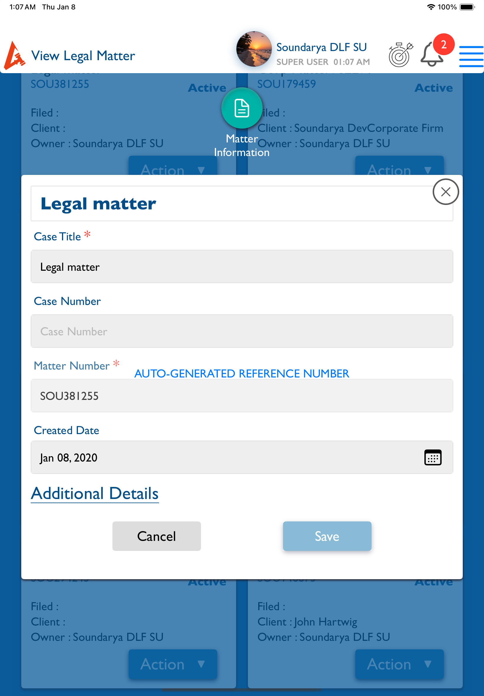 openMatter (Create – Legal): The Matter Creation Date field should accept past dates, consistent with the web application.