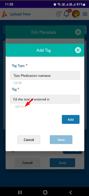 openDocuments (Upload): While uploading documents to a Matter/Client/Firm, try to edit the metadata and add tags. The tag field limit count shows an invalid number.
