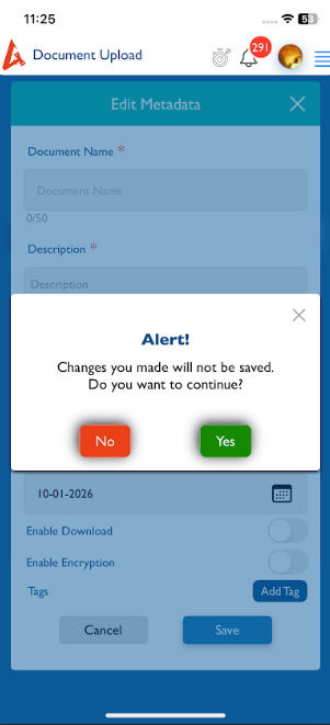openDocuments (Upload): After editing the metadata for a selected document, clicking Cancel displays an alert. The alert format should be updated to match iOS standards.