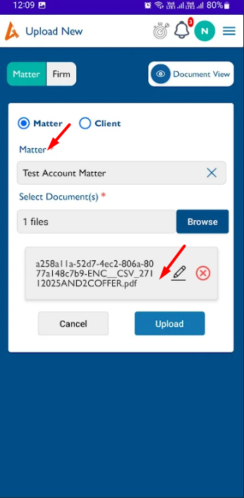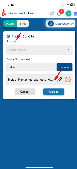 - Subject changed from Documents(Upload):- to Documents(Upload):- The Matter dropdown heading text 's' is missing and the selected document name read more "..." should be implemented