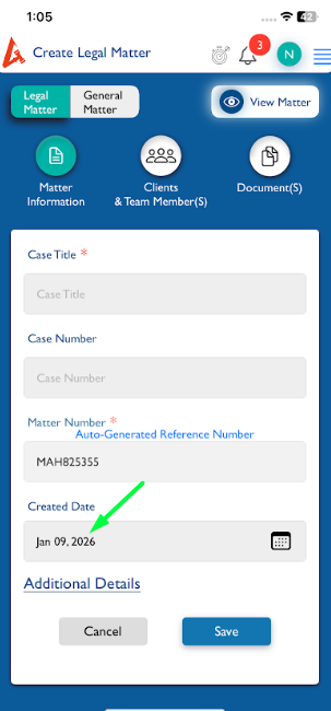 - Subject changed from Matter(Create Legal/General):- Change the Created date as a mandatory fields as per web and iOS to Matter(Create Legal/General):- Change the Created date as not mandatory fields as per web and iOS