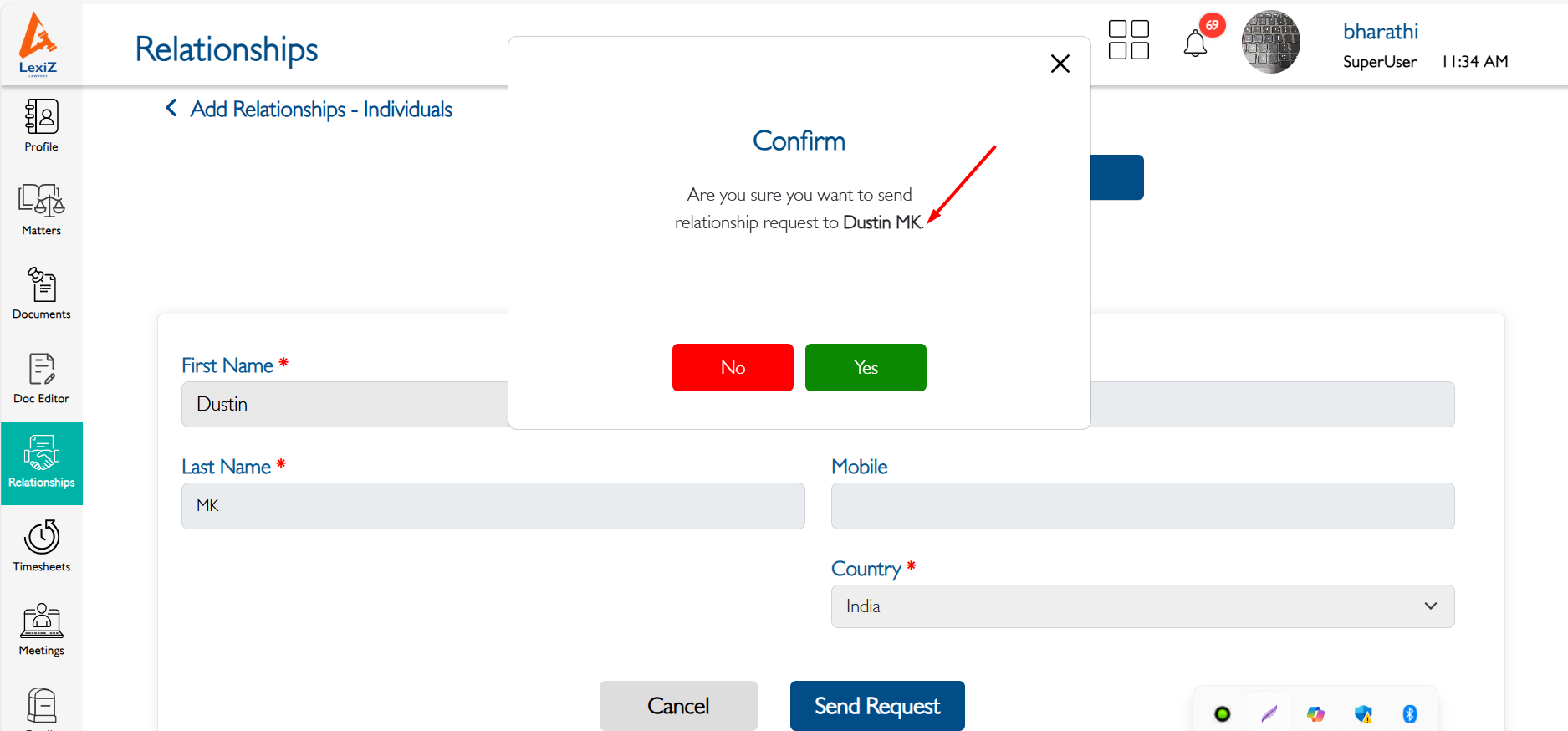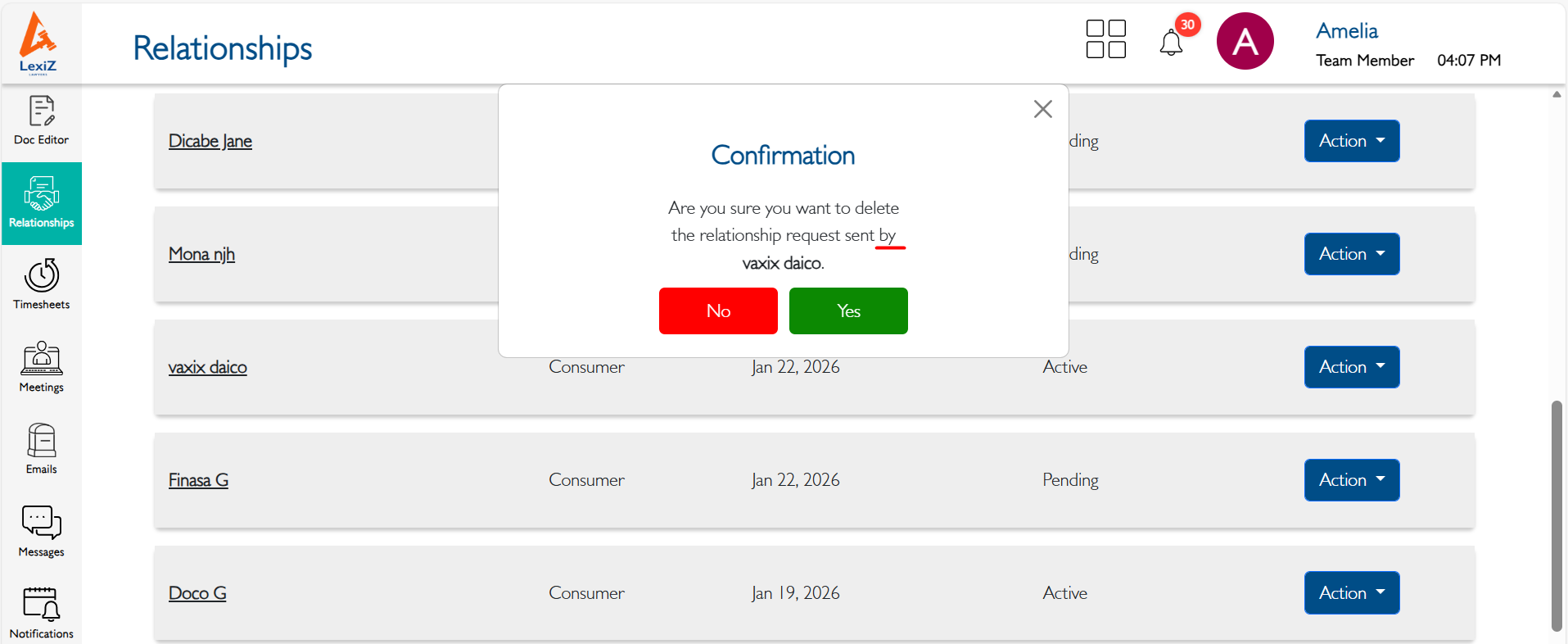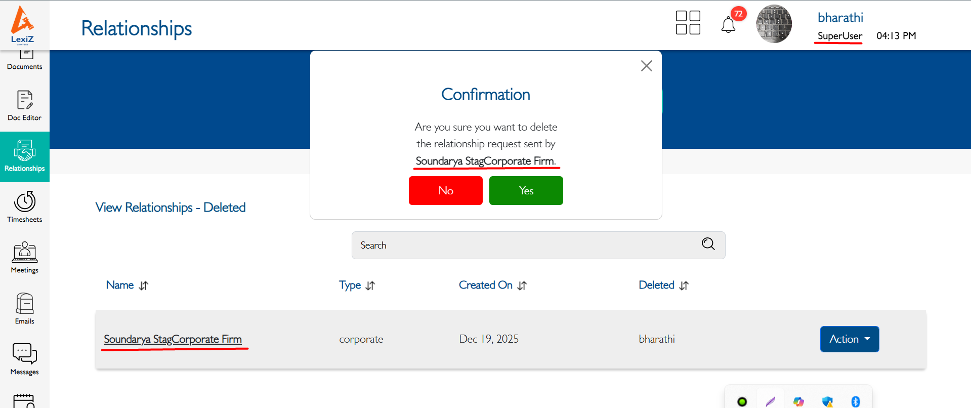 “Are you sure you want to delete the relationship request sent by <sender name -> firm name/ user name>?”