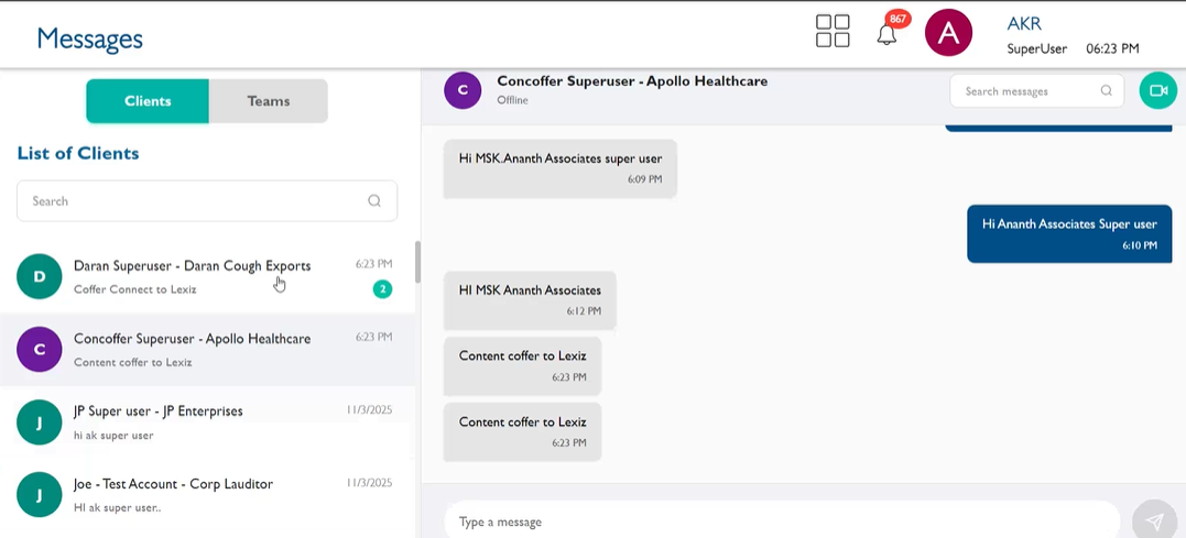 Chat (Messages):-The received unread message counts on the Client Listing page partially appear for Entity Clients.