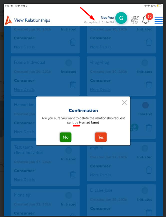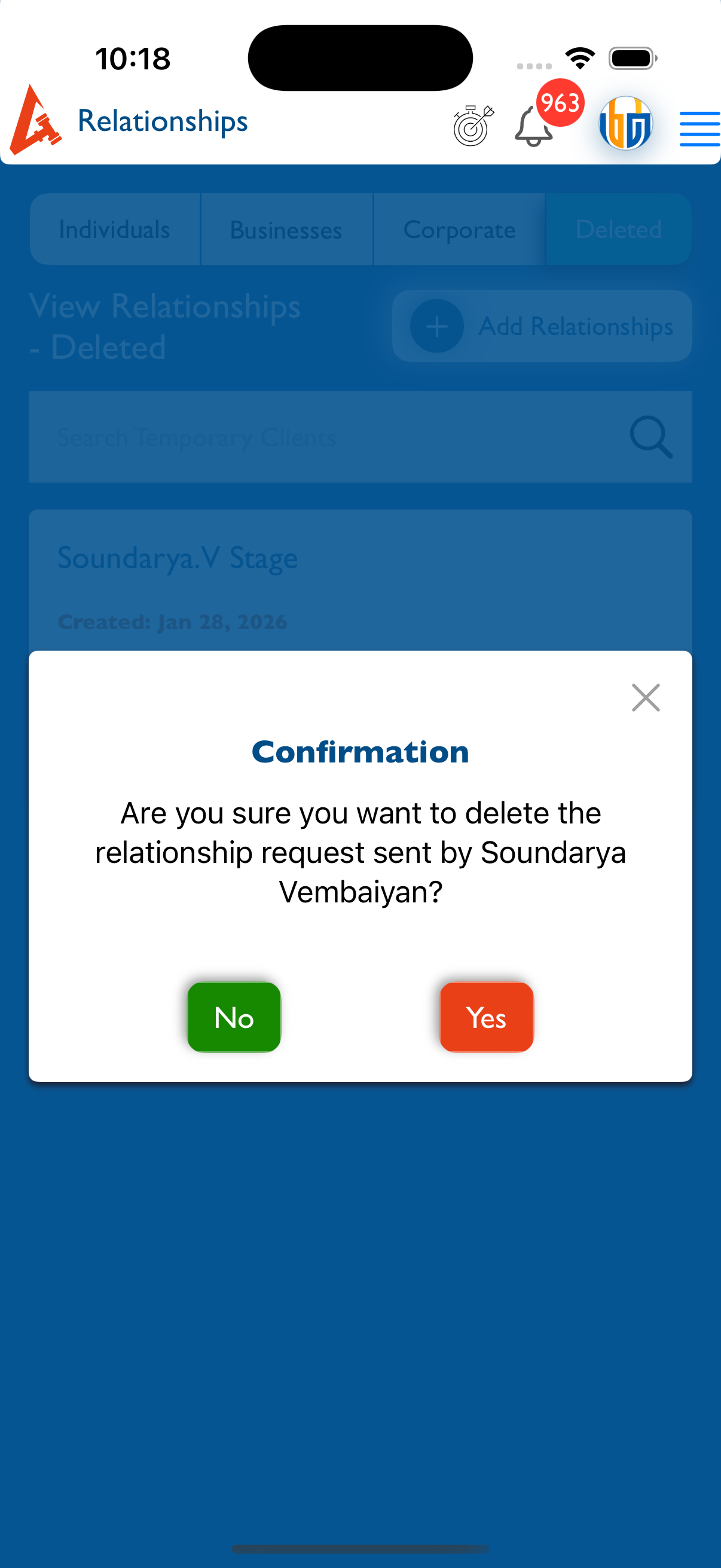 Sender side: “Are you sure you want to delete the relationship request sent to <client name>?”