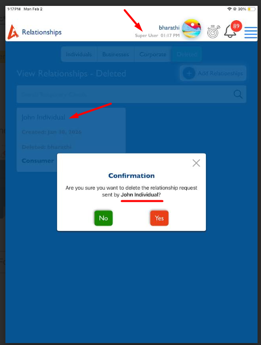 When SU approves the deletion [click on delete relationships in deleted tab] - Instead of sender name [who deletes the relatioships] client name appears