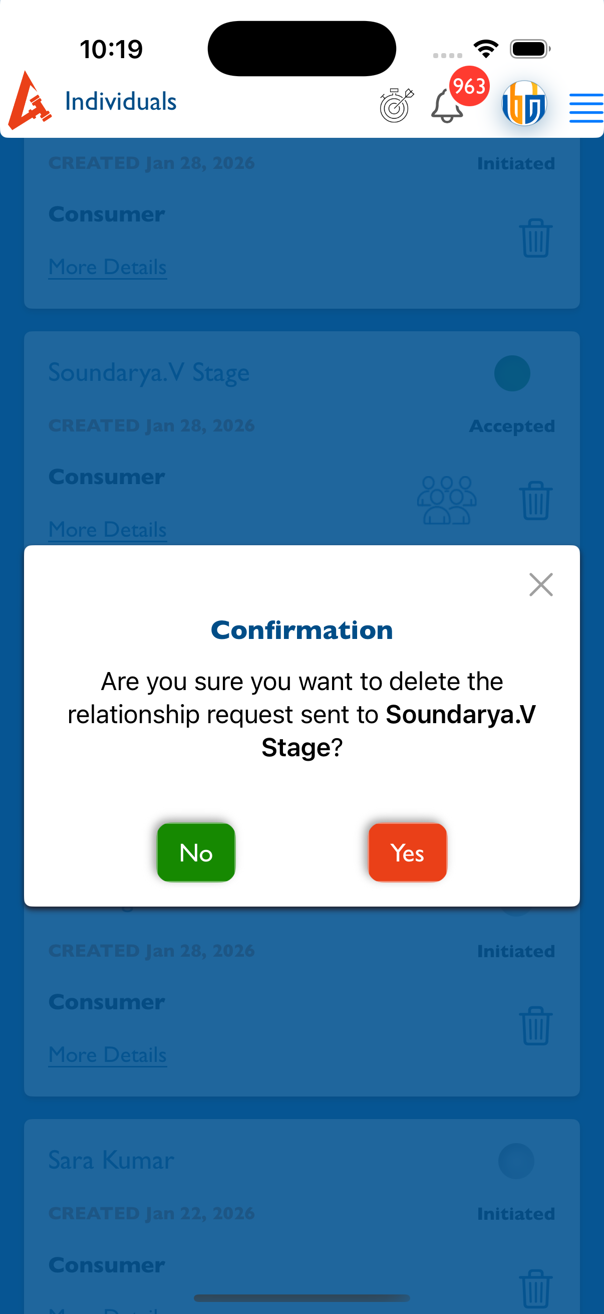 “Are you sure you want to delete the relationship request sent by <sender name>?” - Here sender name means who deleted that relationships