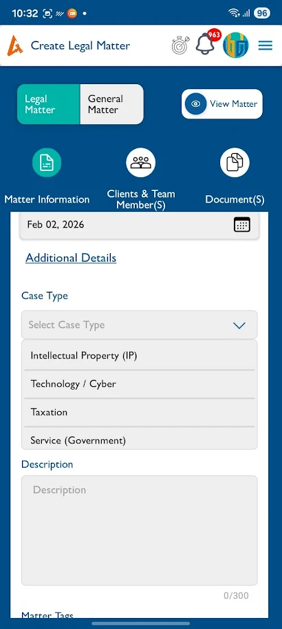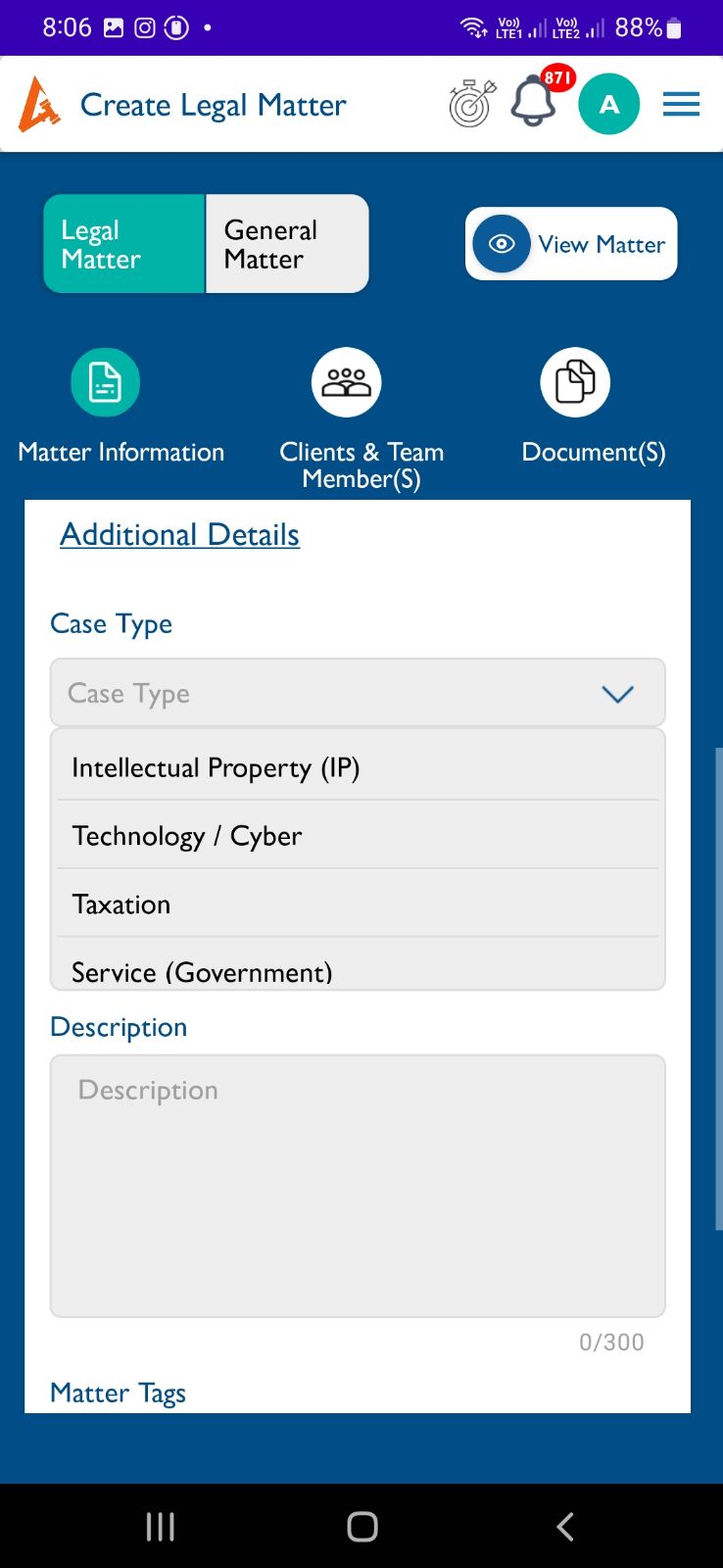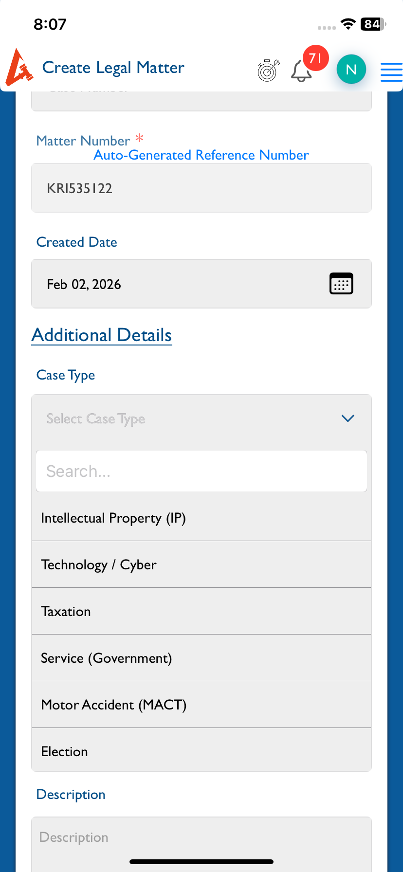 openMatter (Create):- The Matter create page Case type dropdown hint text and search option should be implement as per iOS