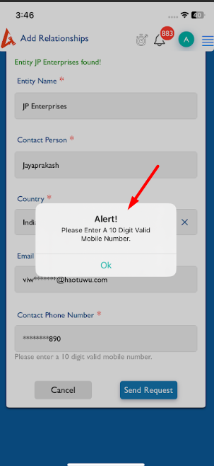 Relationships (Add): When trying to send a request to an entity client, after finding the entity and clicking the Send Request button, a warning appears stating that the mobile number is invalid because it is masked.